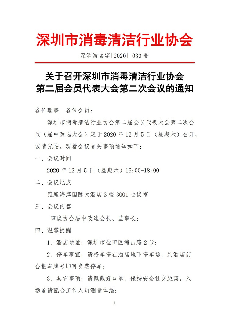 关于召开深圳市消毒清洁行业协会第二届会员代表大会第二次会议的通知