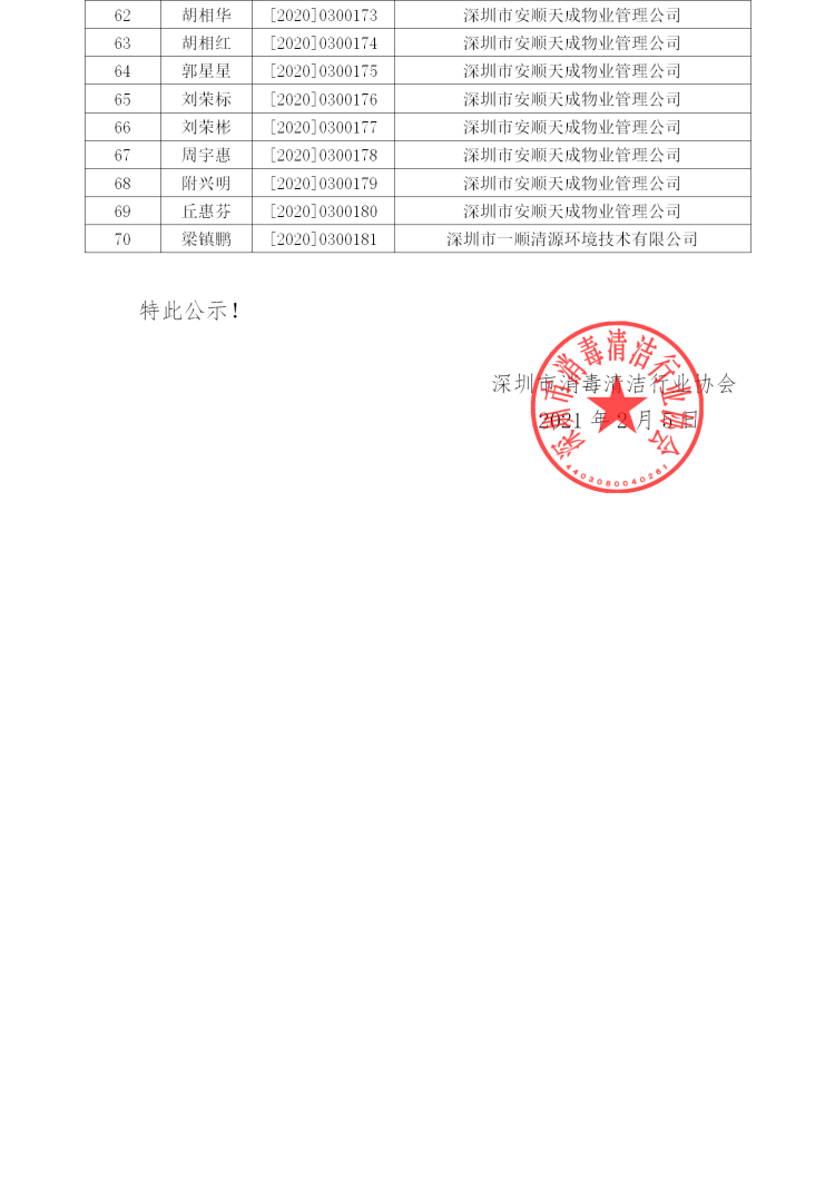 深圳市2020年公共环境消毒清洁高级技能培训班合格人员名单公示