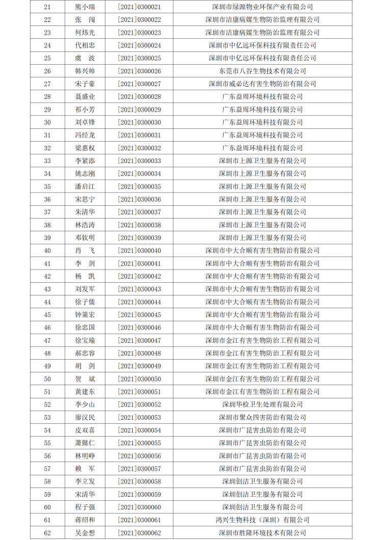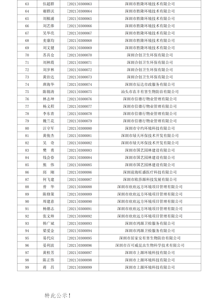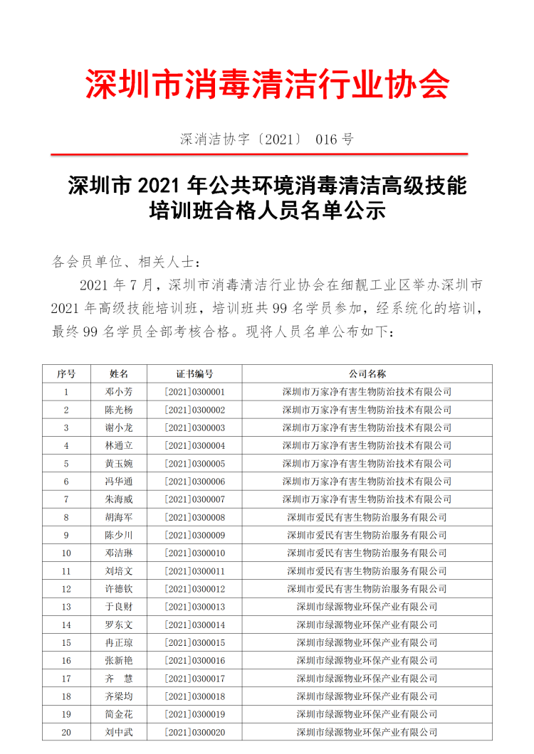 深圳市2021年公共环境消毒清洁高级技能培训班合格人员名单公示