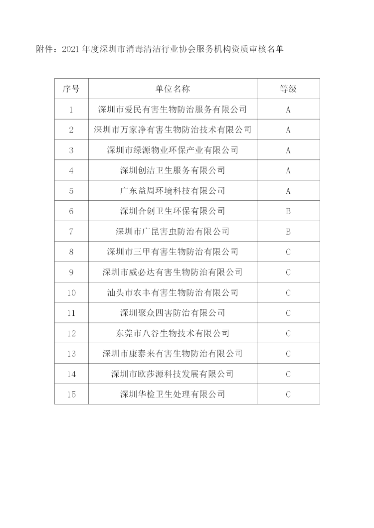 关于2021年深圳市消毒清洁机构公共环境服务能力等级审核通过的名单